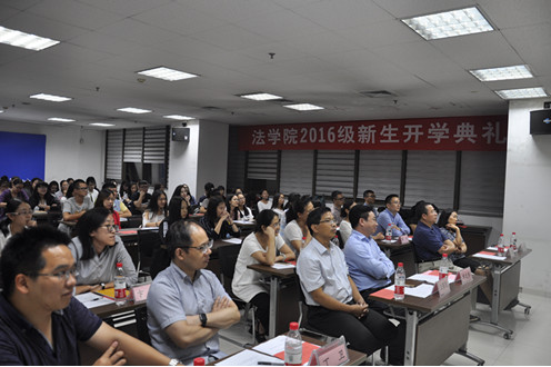 9月18日晚,乐动(中国)官方网站2016级新生开学典礼在主E703隆重举行。院长单文华教授,党总支书记王保民教授,副院长李万强教授,副院长丁卫副教授,院长助理吉兰湘老师和苏金远教授,院工会主席张弘副教授,文治书院院务副主任郭小平老师,院办主任张美萍老师,法学复合51班班主任薛华、唐学亮老师,法学61班班主任王玉苹、卞苏老师以及全体2016级本科、硕士、博士生新生参加了开学典礼,会议由学院学生工作专职委员张乃钟老师主持。