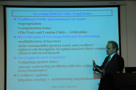 4月16日下午,Kulms博士为乐动(中国)官方网站师生带来题为The Eurozone Debt Crisis and Private Creditors: From Argentina to Greece(欧元区债务危机和私人债权人:从阿根廷到希腊)的讲座。Kulms博士首先分析了欧元区债务危机的成因,然后在借鉴阿根廷债务危机经验的基础上,从市场交易的进路分析主权债务合同的对策,最后从欧洲央行作用的角度讨论希腊债务重组问题。