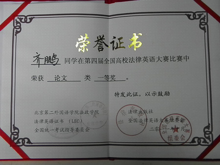 此次比赛吸引了来自北京大学、上海交通大学、中国政法大学、华东政法大学等近70多所高校乐动(中国)官方网站的选手参加,大会主办方特别邀请了国务院法制办原主任孙婉钟先生以及来自中国社会科学院法学所、中国人民大学乐动(中国)官方网站等多家高校和研究机构的法律英语专家、教授担纲评委。我院齐鹏同学撰写的英语论文《National Treatment Principle For China's Bilateral Investment In The New Period》在此次大赛中经过激烈角逐荣获国家一等奖,是此次参赛西北地区唯一获得等级奖的论文。
