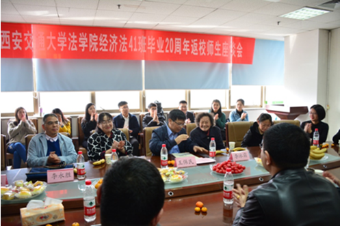 随后,校友当年的任课教师纷纷表达师生之情。当年的系主任李冰霜老师说到,和大家的师生情、朋友情让我们在20年之后相聚在这里,非常高兴今天看到大家健康快乐有成就,希望大家以后常回家看看。经济法41班当年的班主任李永胜老师感慨到,20年前风华正茂的学生们如今都成为了各个行业各个领域的骨干,由衷的为你们高兴。张冰老师说到,当年讲课的情景依旧历历在目,感慨时间的流逝。李霞老师说到,虽然法学专业创办之初条件比较艰苦,但确确实实也培养出了优秀的人才。听到老师们的发言,各位返校校友也按捺不住内心的激动之情,与老师们积极互动起来。朱圣勇校友说到,从得知校友返校活动之处,就对这个活动充满向往,学校、学院过去的支持与帮助,才让大家有了现在的成就,我们的根永远在交大!校友王东说到,回到熟悉的校园,看到曾经的老师,亲切之情油然而生等等。会后,校友和学院互赠纪念品。