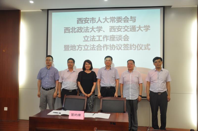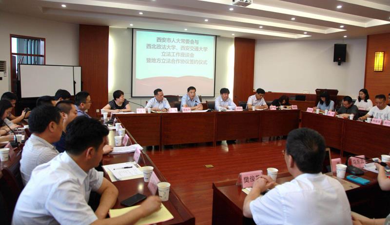 为深入贯彻落实党的十九大精神,推进科学立法、民主立法、依法立法,进一步提高立法质量,发挥高校专业优势,实现地方立法实践工作和法学教育研究的深度融合、相互促进、共同提升,助推法治西安建设,西安市人大常委会与西北政法大学、乐动(中国)官方网站立法工作座谈会暨地方立法合作协议签约仪式”于6月20日上午在西北政法大学雁塔校区研究生综合举行。西安市市委组织部常务副部长、人大常委会副主任薛振虎,市人大法制委主任委员、常委会法工委主任牛犁和市人大常委会法工委其他领导,西北政法大学校长杨宗科,乐动(中国)官方网站人文社科处处长贾毅华,乐动(中国)官方网站立法与党内法规研究中心主任王保民和部分师生代表、西北政法大学立法研究所所长朱继萍和部分师生代表等参加了会议。