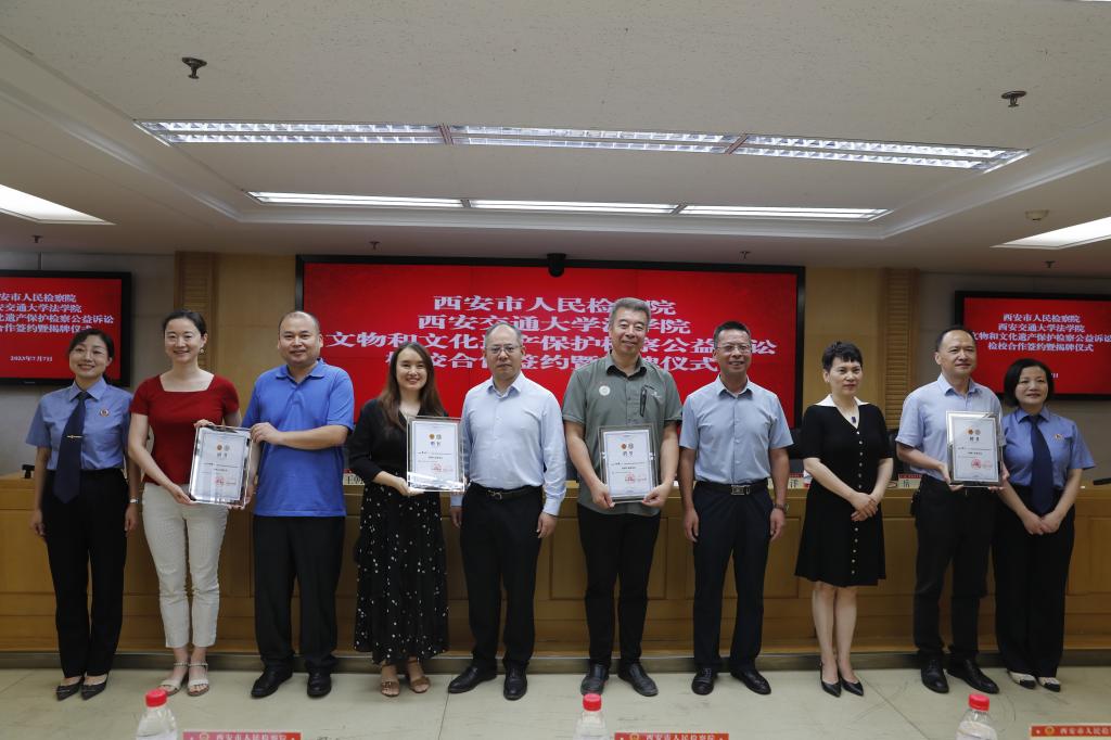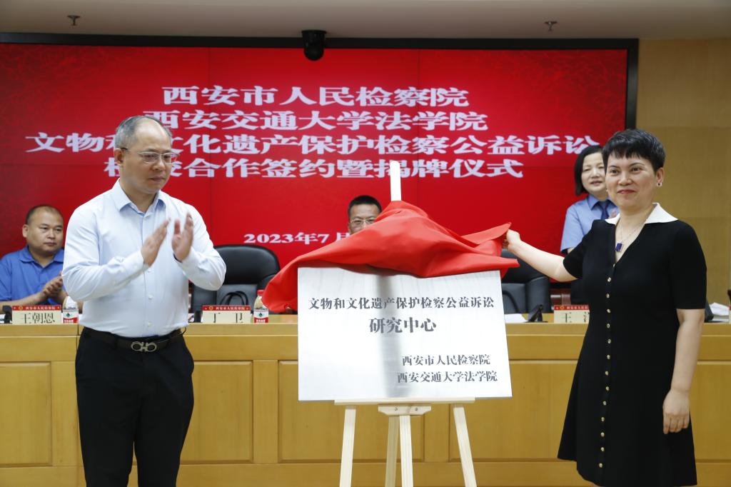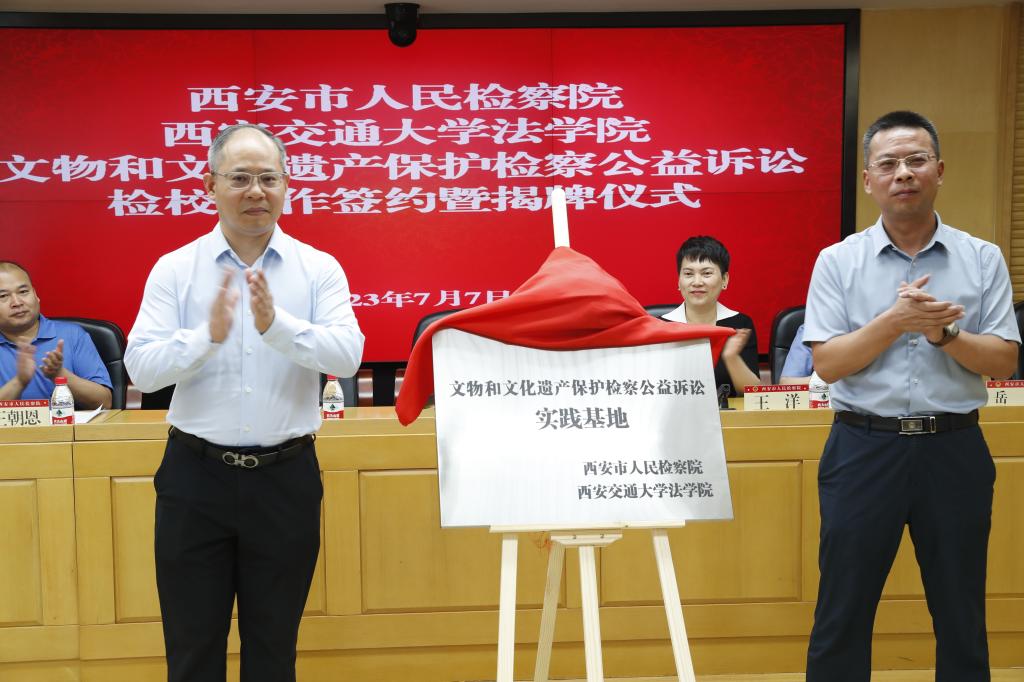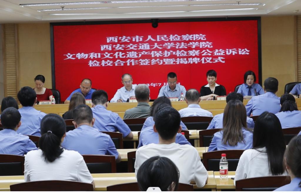 7月7日,西安市人民检察院、乐动(中国)官方网站乐动(中国)官方网站共同举办“文物和文化遗产保护检察公益诉讼”检校合作签约暨揭牌仪式。陕西省人民检察院第八检察部主任王洋、西安市人民检察院副检察长韩柏超等领导,西安市人民检察院第八检察部全体干警、各区县院分管副检察长、公益诉讼部门负责人及实务研究员、乐动(中国)官方网站乐动(中国)官方网站副院长丁卫、乐动(中国)官方网站乐动(中国)官方网站的王朝恩研究员、刘丽娜副教授、特聘专家研究员代表以及西交大乐动(中国)官方网站首批11名实习生出席仪式。